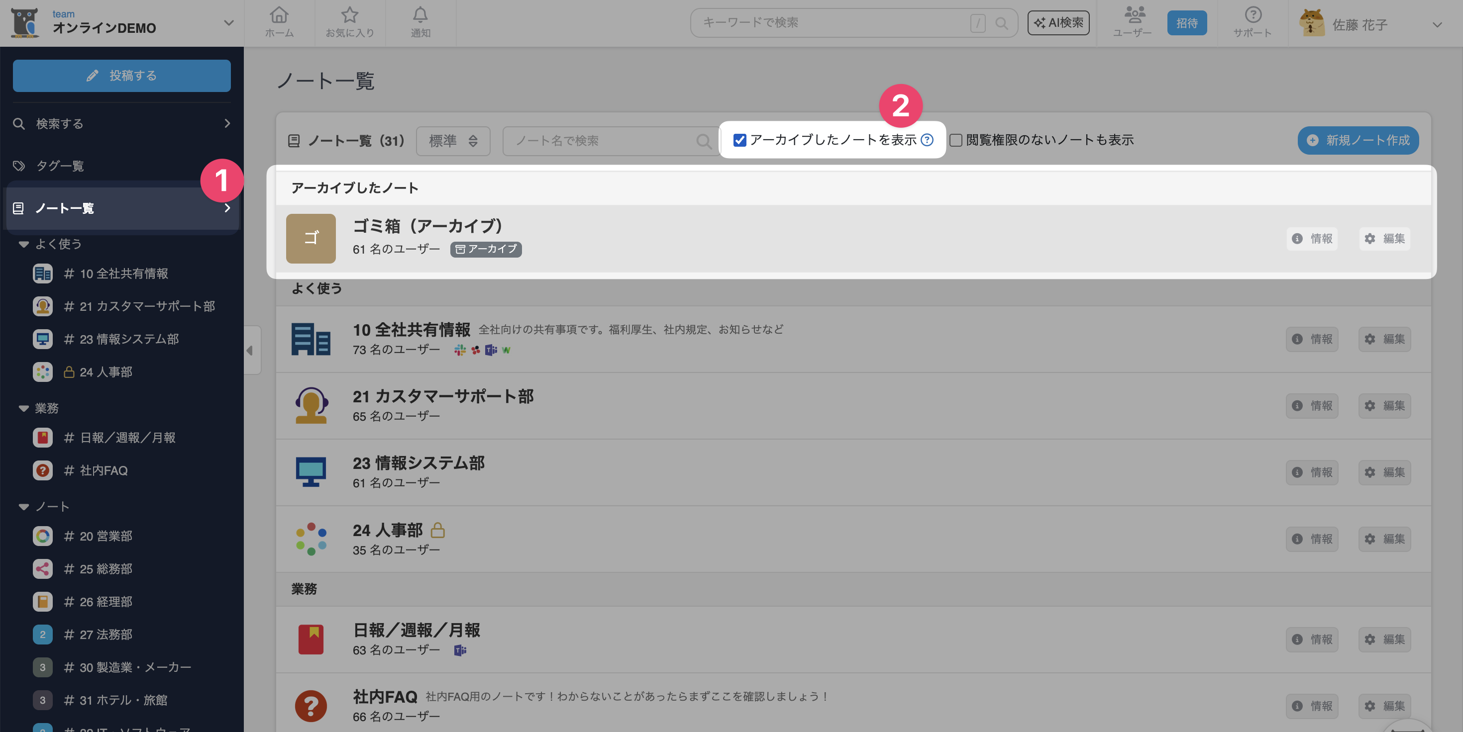 表示させたい場合は、「アーカイブも対象にする」にチェックを入れて検索してください。 - アーカイブしても、ノート・ページ・コメントなどのデータは消えません。(非表示状態になります)