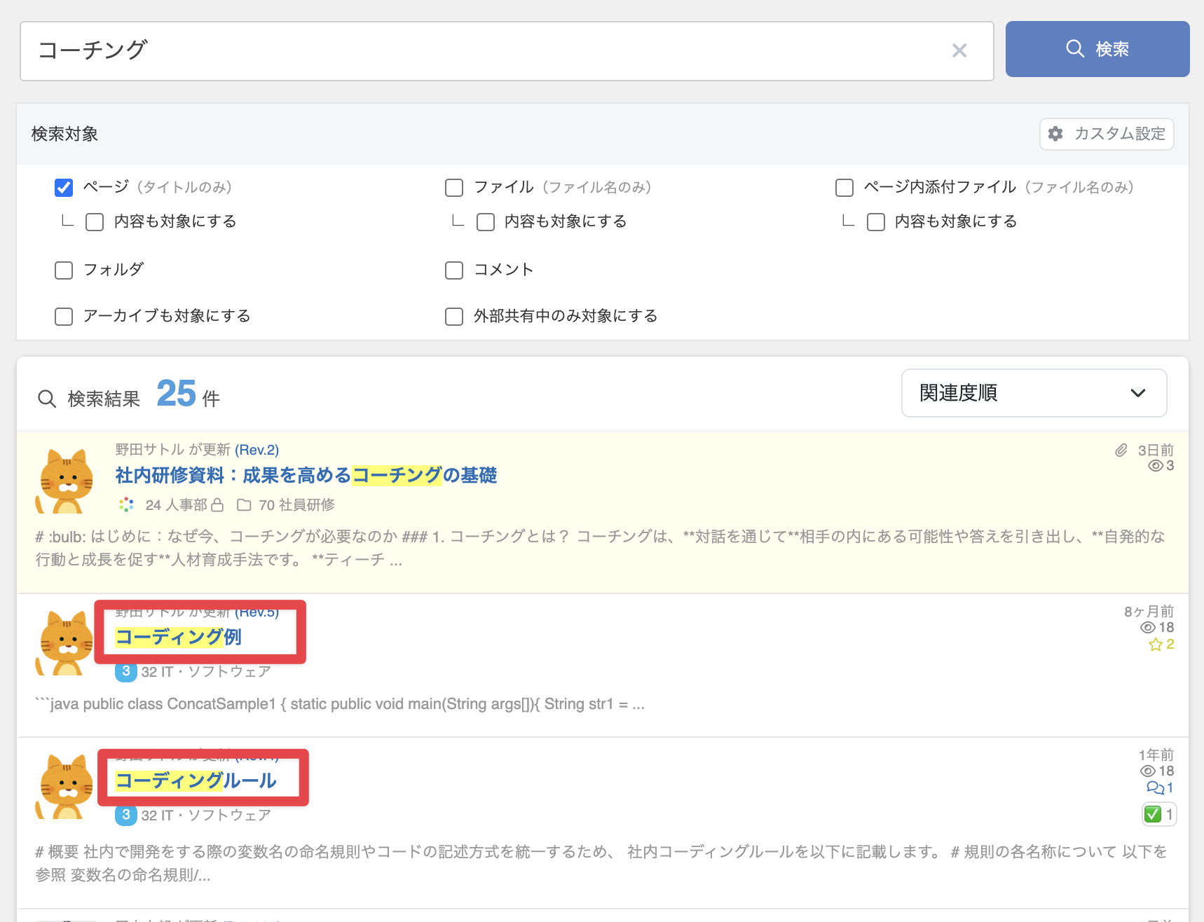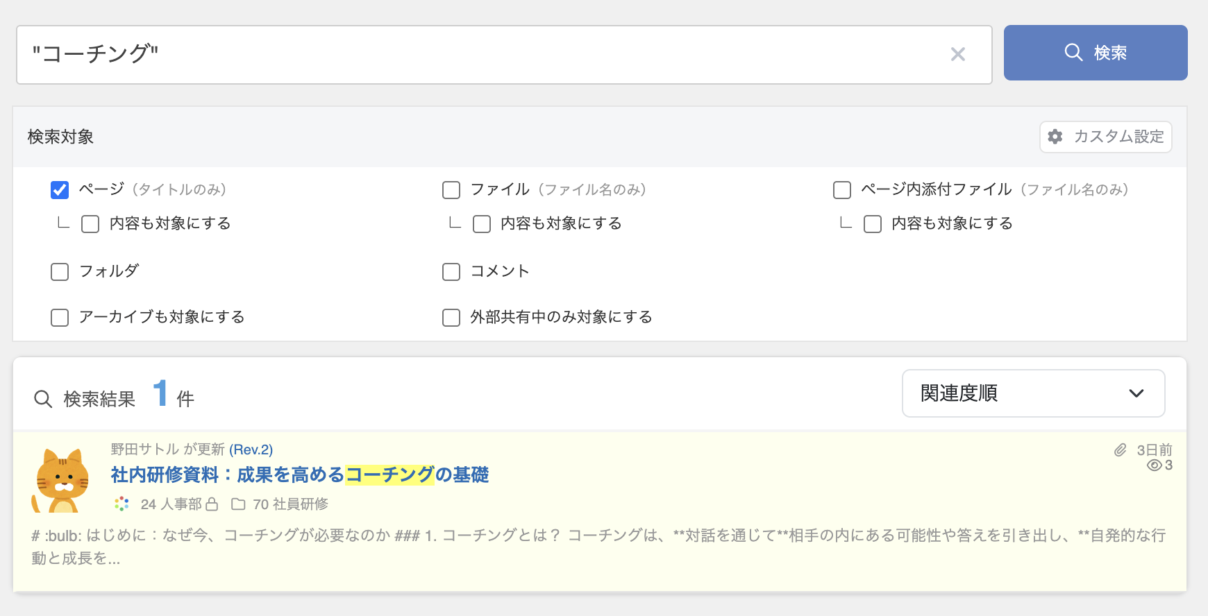 ページやファイルの中身を全文検索したり、タイトルだけで絞り込んで検索できます。