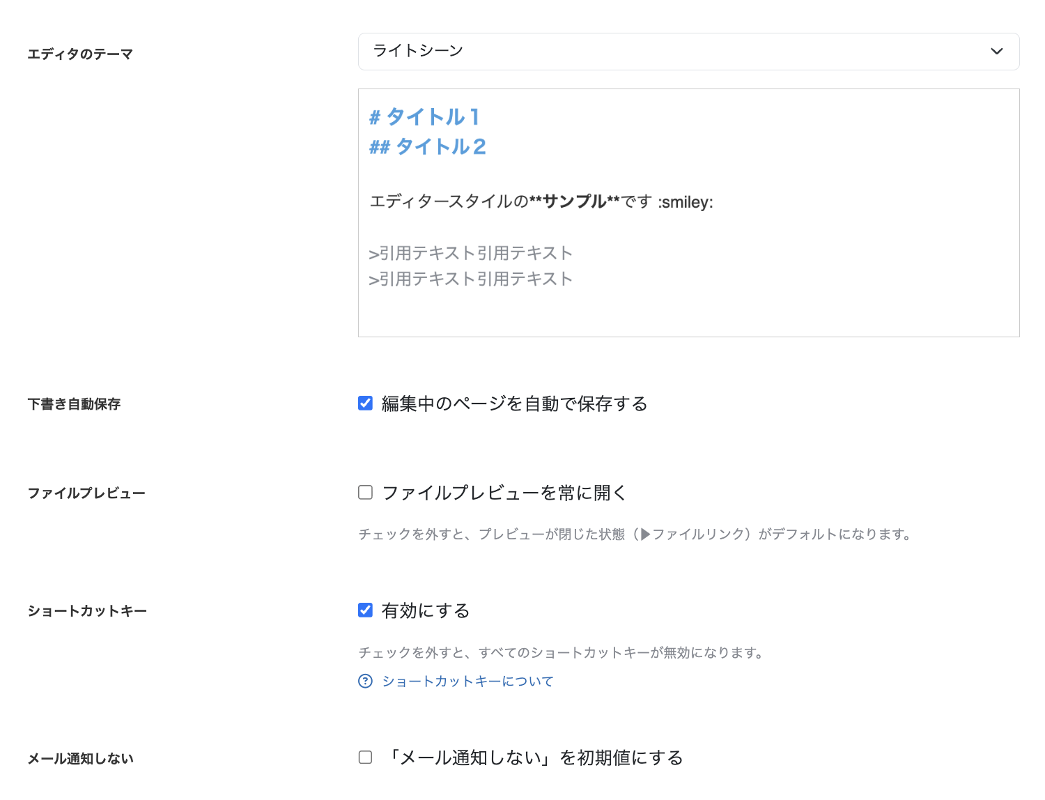 エディタを設定する エディタ設定とは、ページの表示や編集画面の設定を、個人ごとに変更できます。 右上[ユーザー名]>[個人設定]>[エディタ設定]をクリックします。 エディタの設定画面が開きます。 各種設定事項のヘルプページは以下の通りです。お好みに合わせて設定してください。 エディタのテーマを設定する 下書きの自動保存を設定する ファイルプレビューをデフォルトにしない設定方法 ショートカットキーをOFFにする 「メール通知しない」チェックをデフォルトに設定する 関連記事 チームのエディタを設定する スマートフォン(スマホ)のホーム画面にアイコンを追加登録する方法(iPhone/Android) 🔰【利用者ガイド】NotePMの基本的な使い方 エディタのテーマを設定する アカウントロック機能