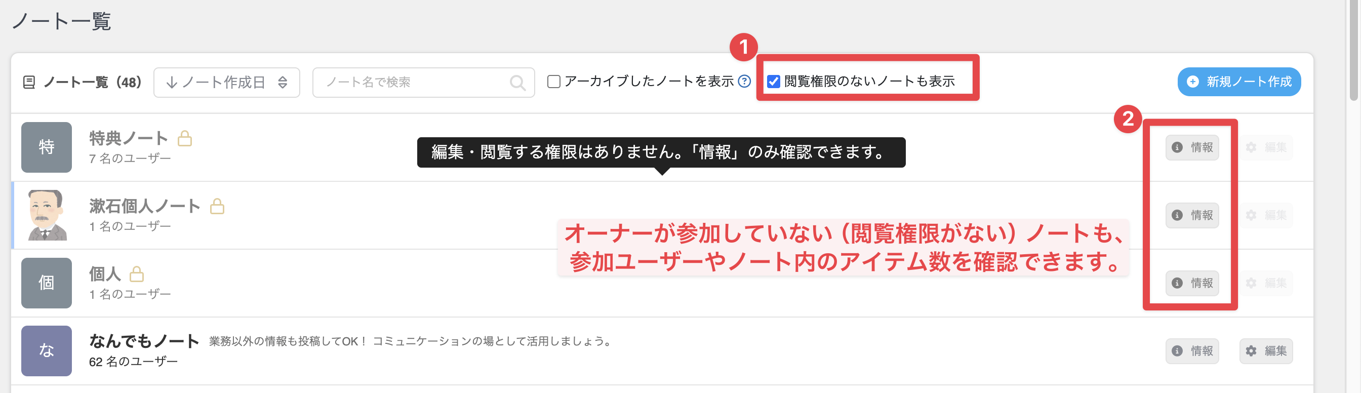 オーナーが参加していないプライベートノートも、