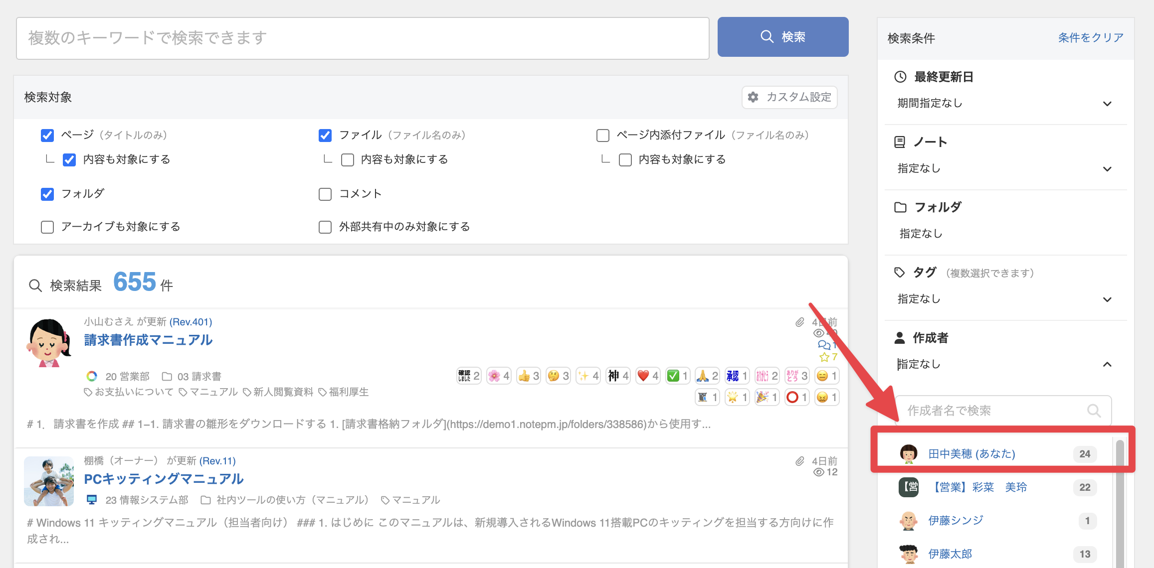 検索画面の作成者絞り込み候補欄の改善
