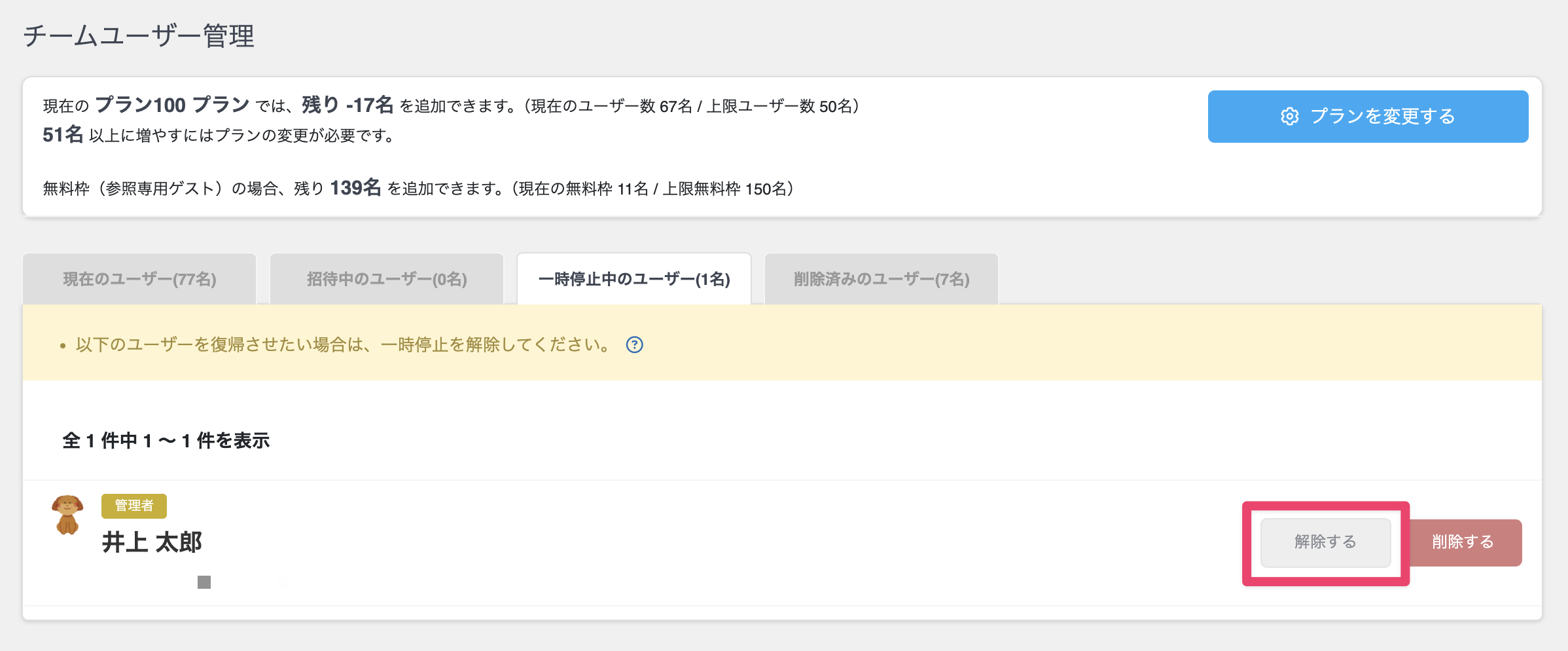 - 解除したいユーザー右横の[解除する]をクリックすると、一時停止を解除できます。