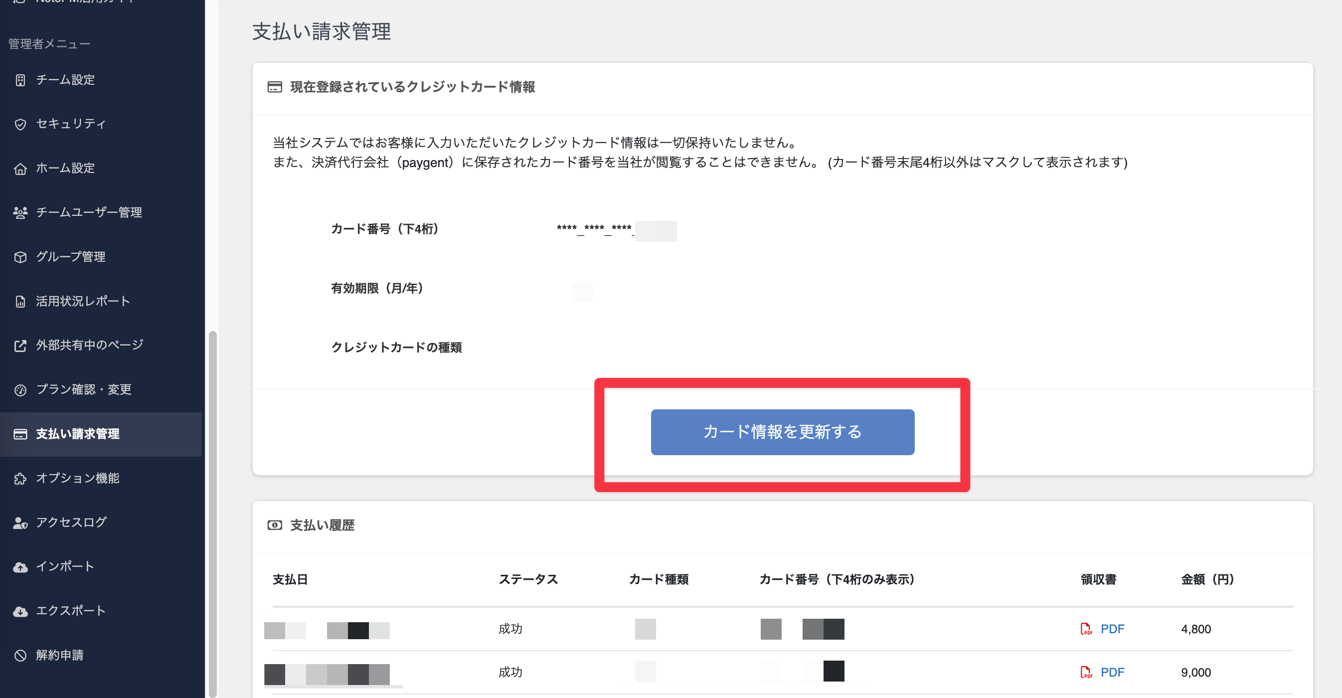 - 「支払い請求管理」画面>「カード情報を更新する」をクリックする