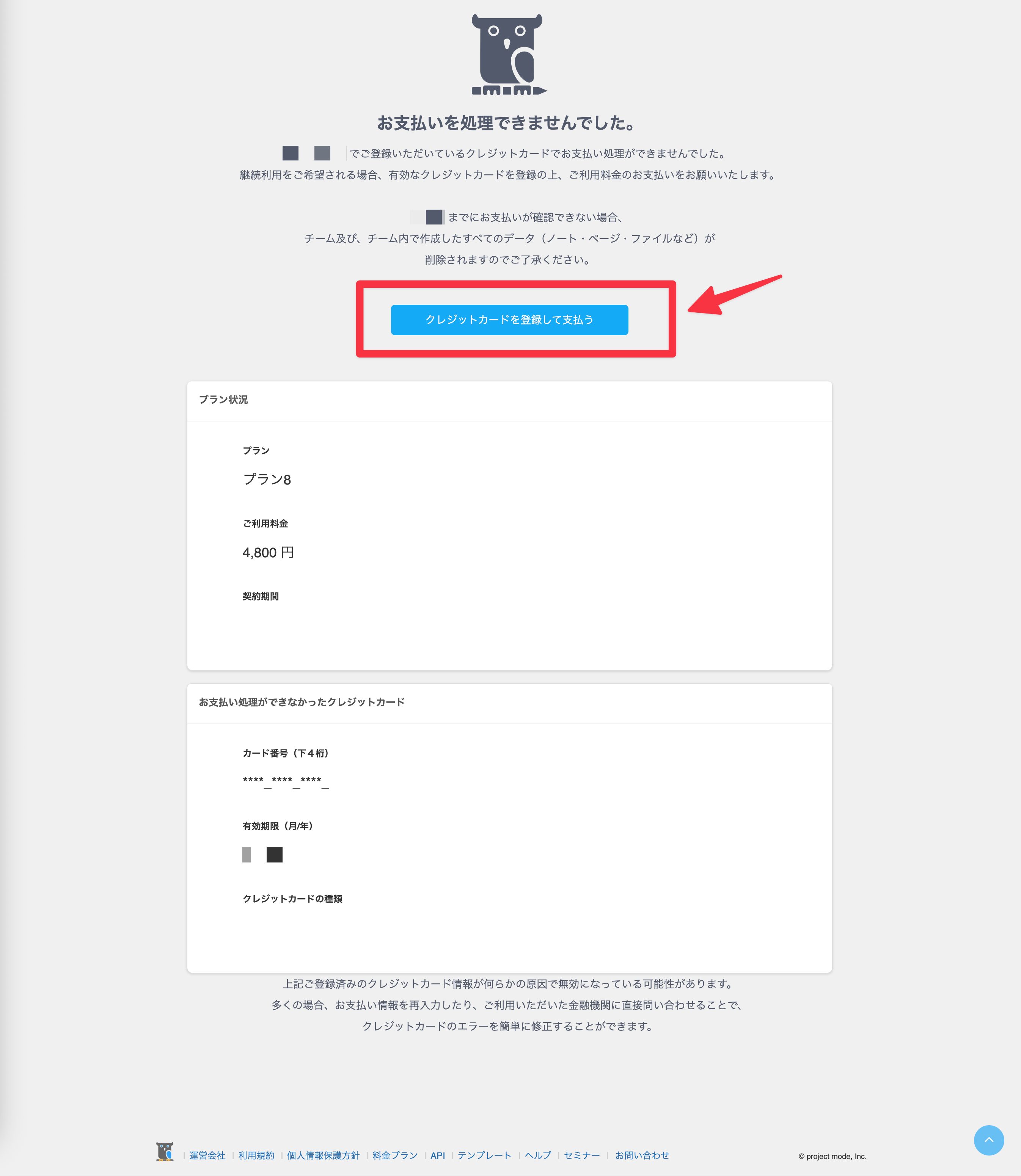 一定回数クレジットカードの決済に失敗すると、チームがロック(一時停止)され、アクセスしてもログインできません。