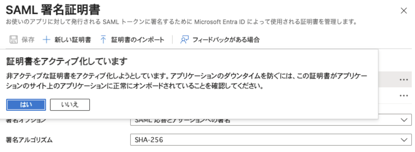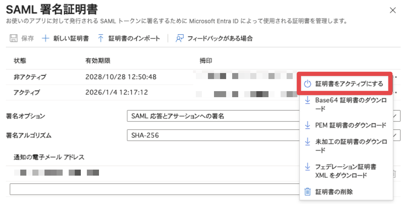 - Microsoft Entra ID側のSAML証明書の編集右側のメニューを開き、証明書をアクティブにするをクリックします。