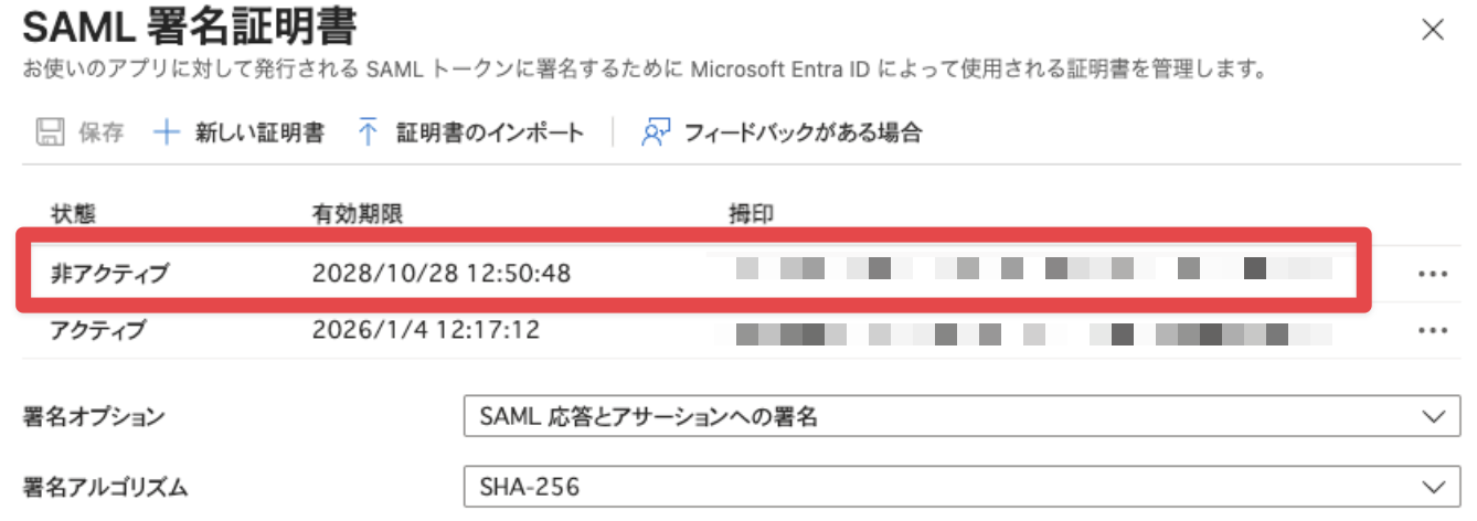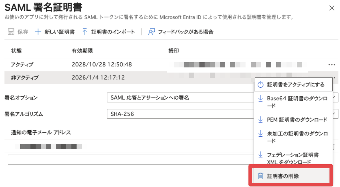 - 問題なければ、Microsoft Entra ID側の古い証明書を削除します。