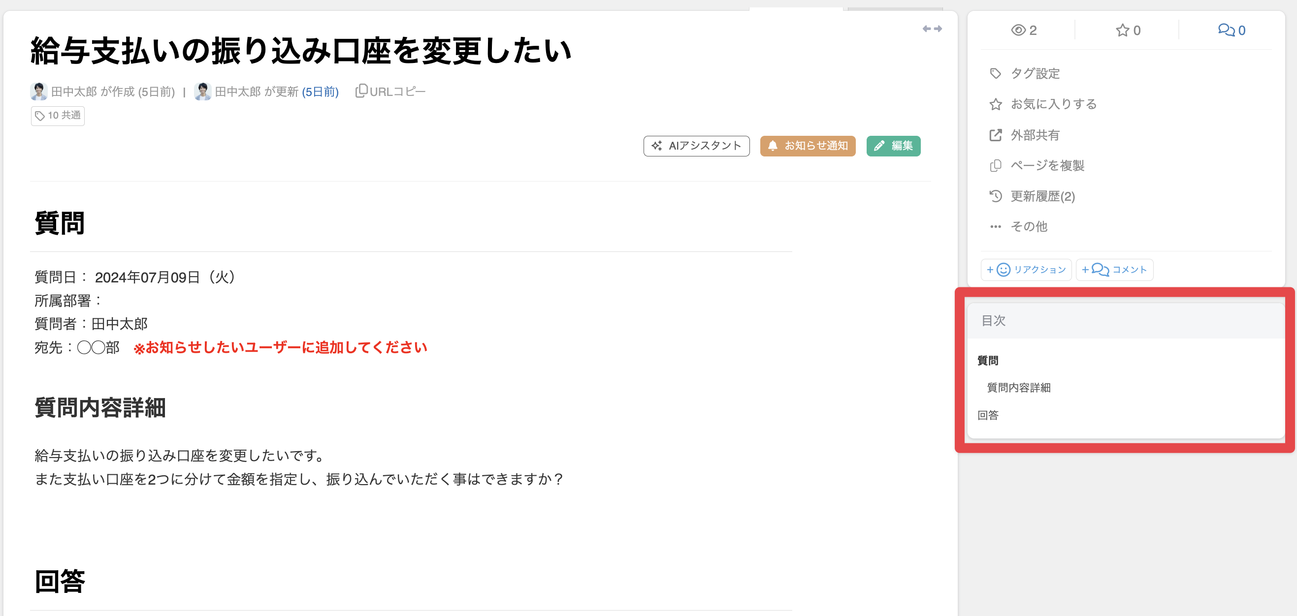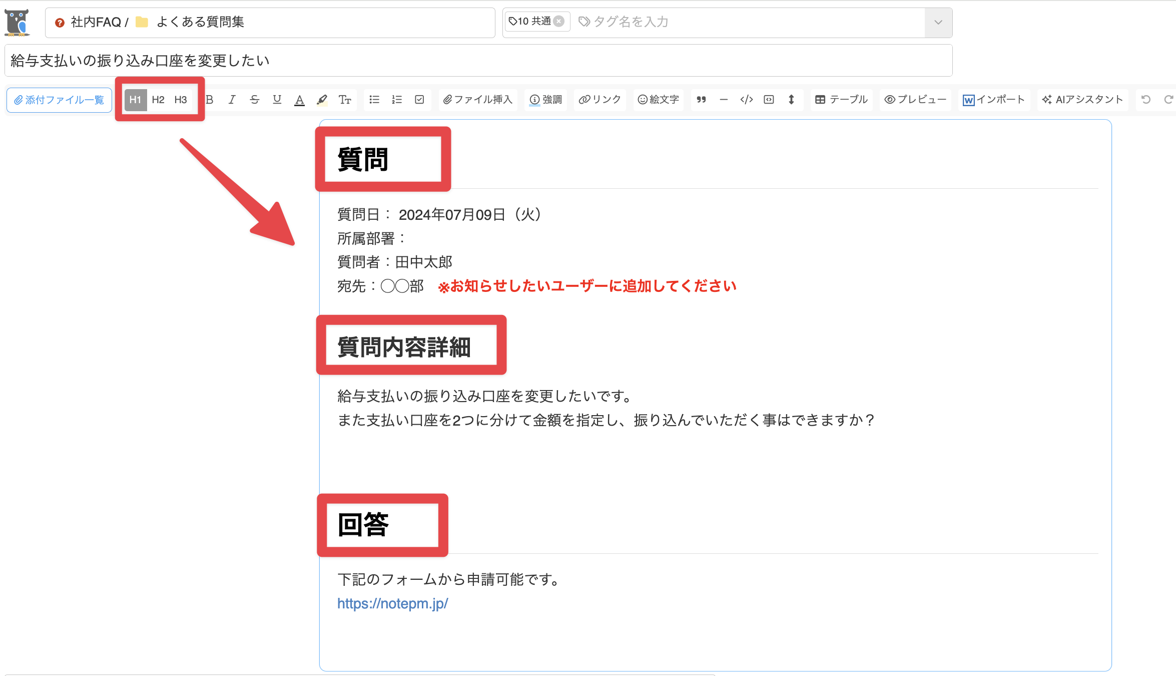 目次の作成方法を教えてください。 目次は「見出し1」「見出し2」「見出し3」を入力した場合、ページ右側に自動で作成されます。*スマホ・タブレットのように、画面表示サイズが小さい場合、目次は表示されません。 関連記事 Markdown記法/書き方(見出し・表・リンク・画像・文字色など) Step5 NotePMにデータを移行しよう 2025-05-25【新機能リリース】リッチテキストエディタのリリース・編集画面全体のUI/UXを改善 活用されるマニュアルの運用のコツ 2026-02-02【新機能】WordやPDFをAIが自動でマニュアル化!ファイル取り込み機能&タイトル提案機能をリリース📄✨