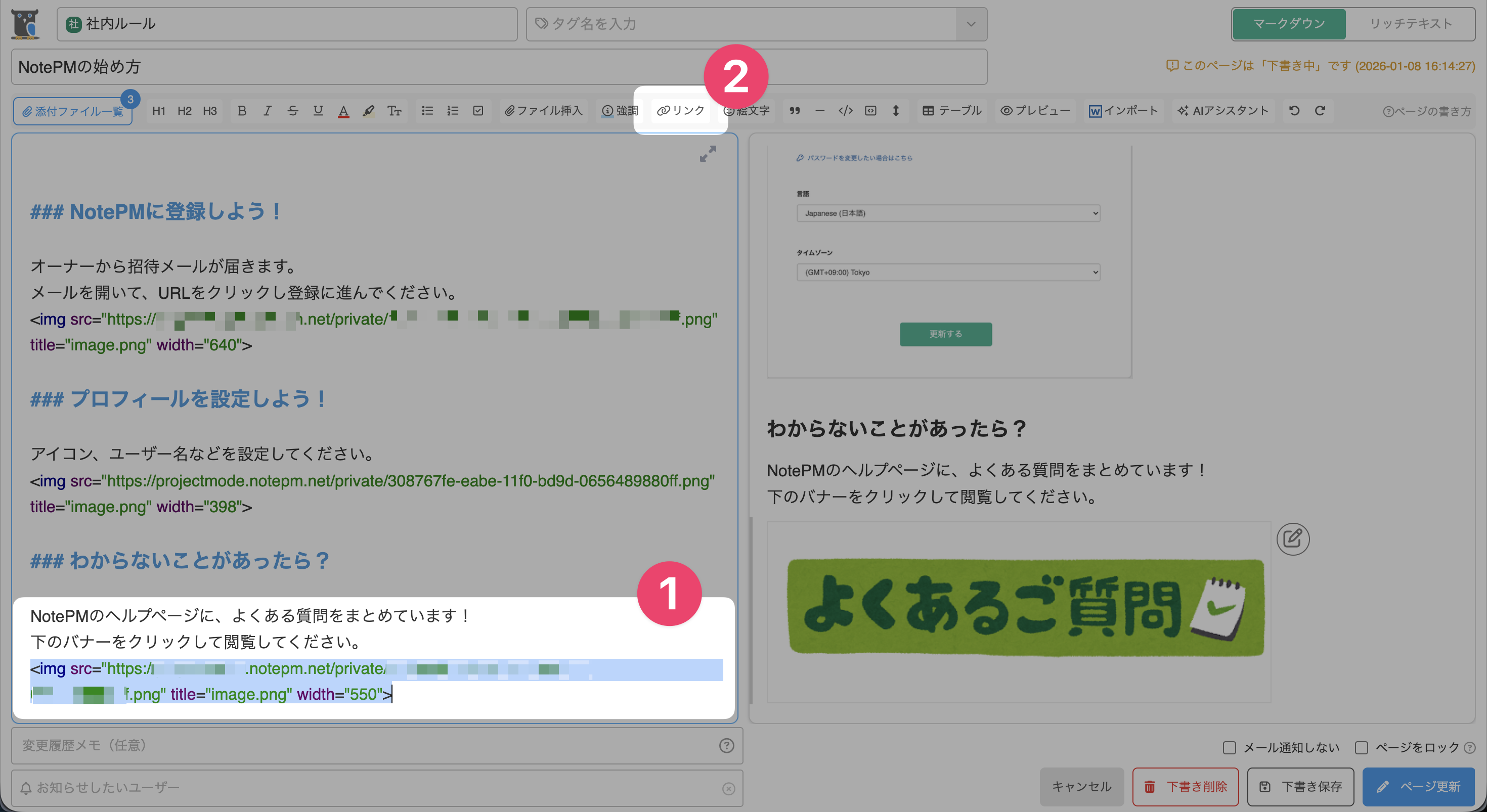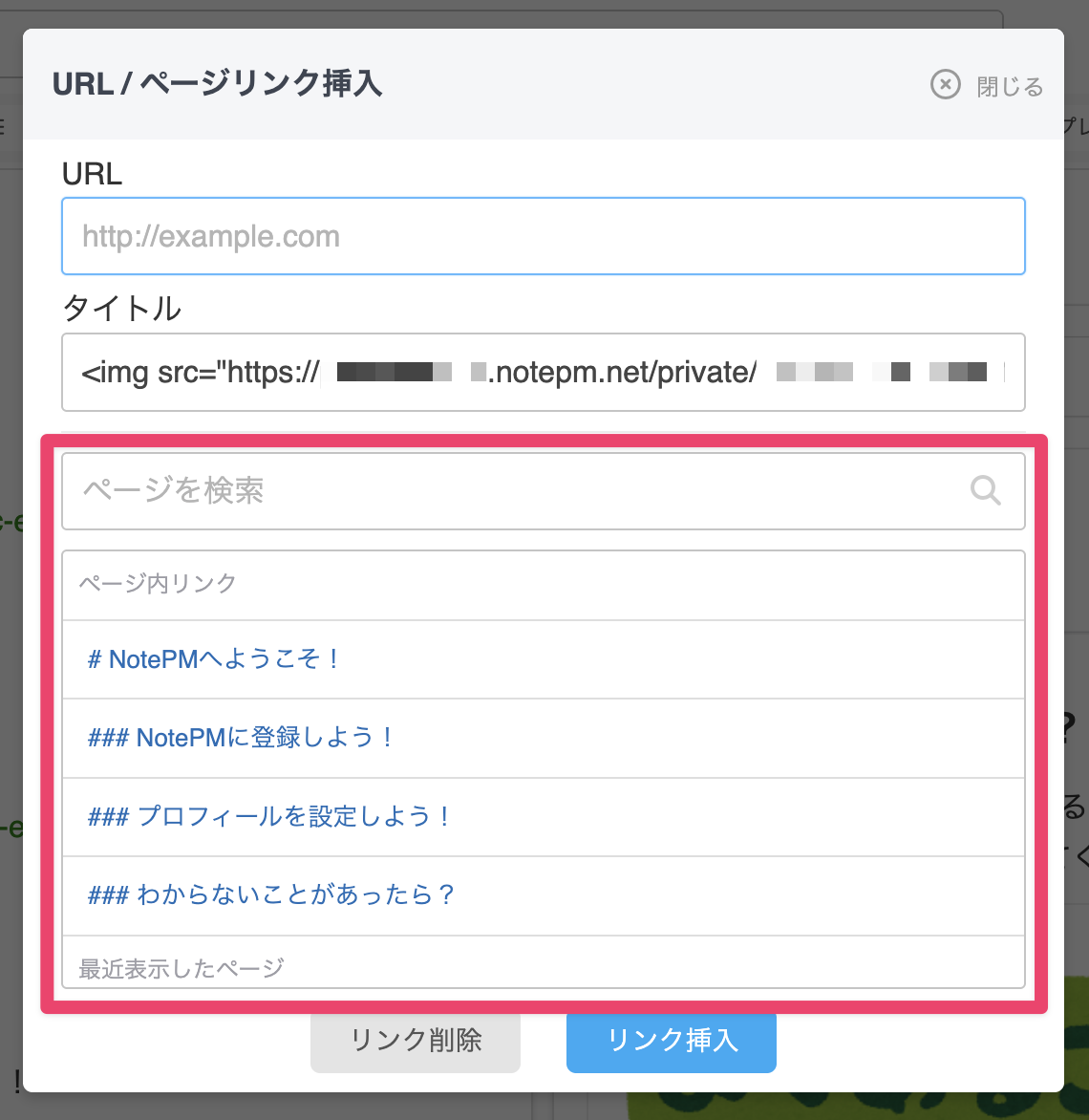 URLリンクを挿入した状態のタグの構成は以下です。[<img src="画像URL.png" title="画像タイトル" width="幅">](挿入したURL)例) [<img src="https://xxxx.notepm.net/private/12345678abcdefc.png" title="画像1.png" width="640">](https://notepm.net/) - ページを登録(更新)し、画像をクリックすると、挿入したURLに移動します。