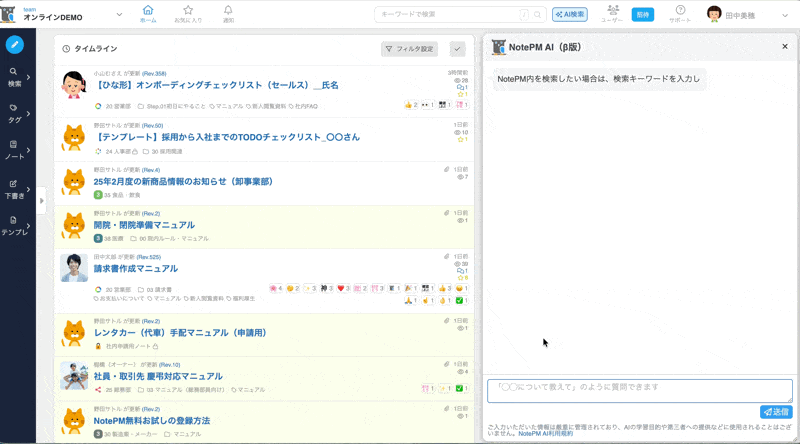 蓄積された社内ナレッジの中からAIが情報を探し出し、あなたの代わりに要約して回答してくれます。