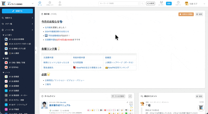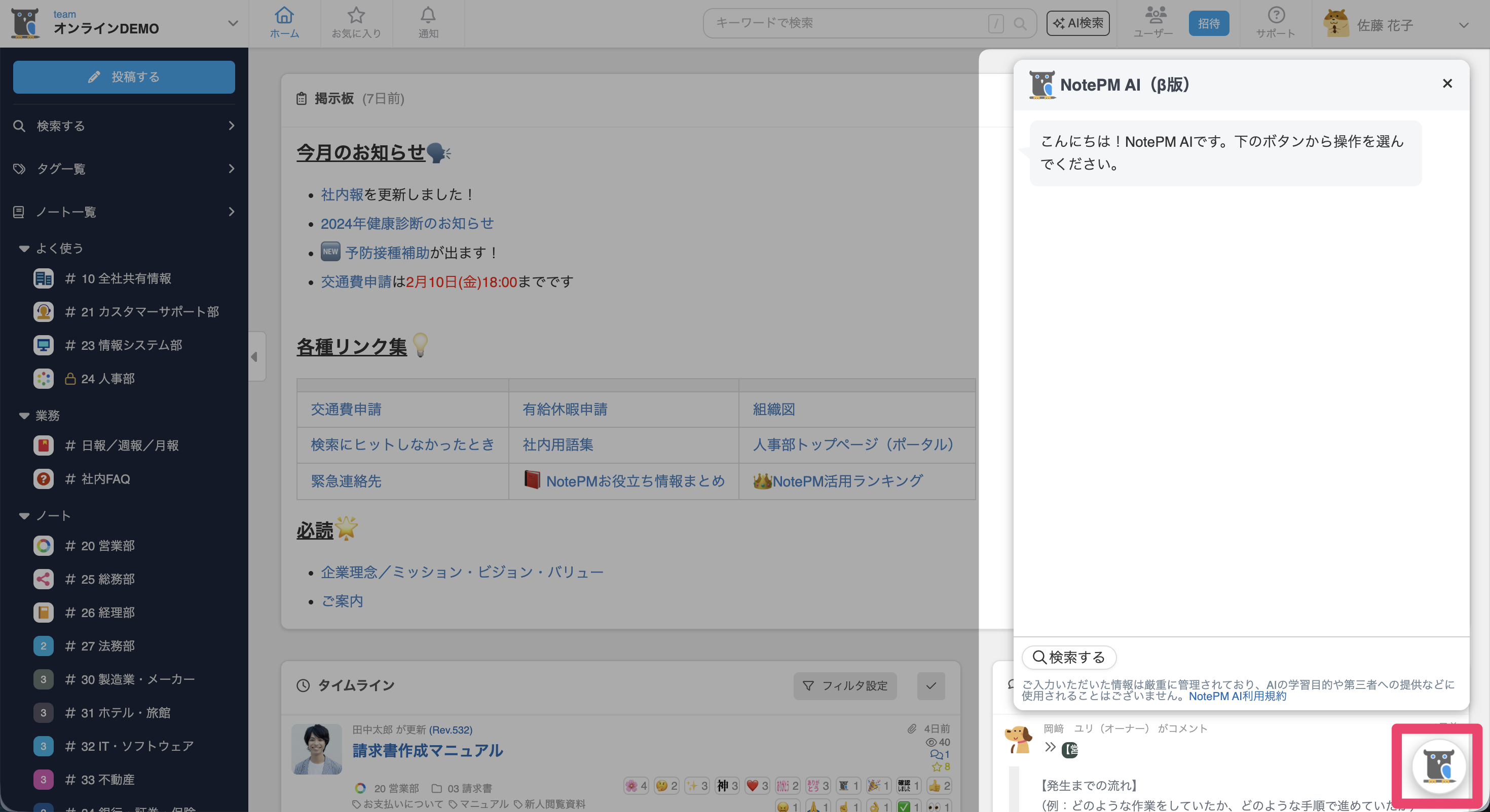 どの画面にアクセスしていても、常時NotePM AIを呼び出せます。