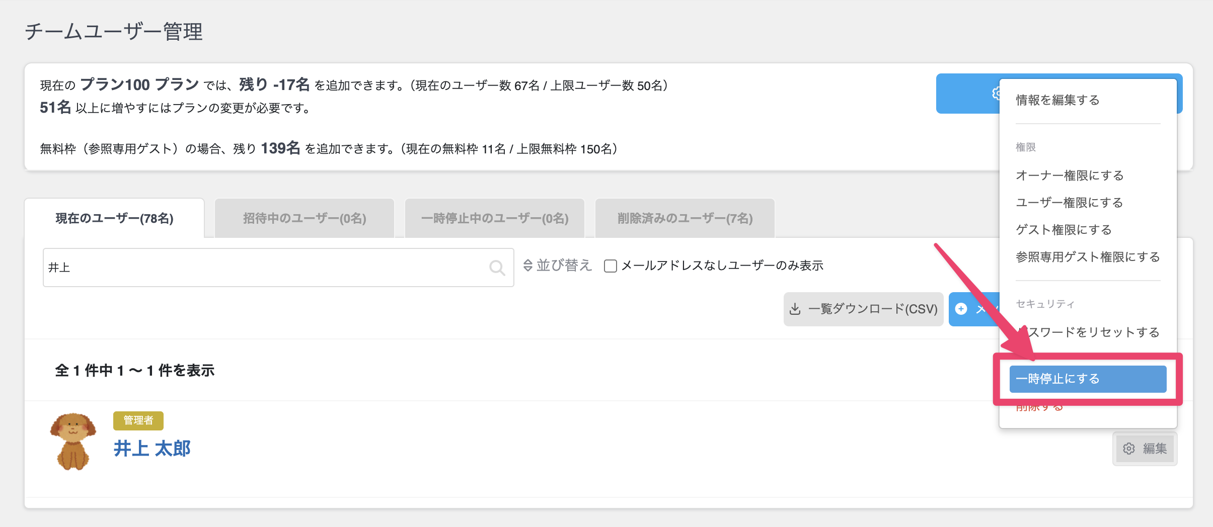 「休職などで一時的にアカウント停止したいが、削除はしたくない⋯」といった場合にご活用ください。