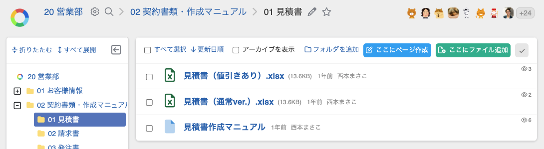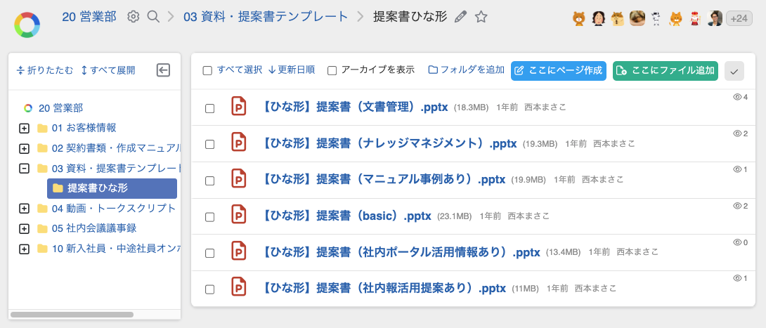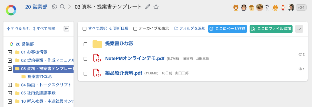 見積もりのひな形や製品パンフレット、過去の成功事例などをフォルダにまとめ、共有する運用例です。