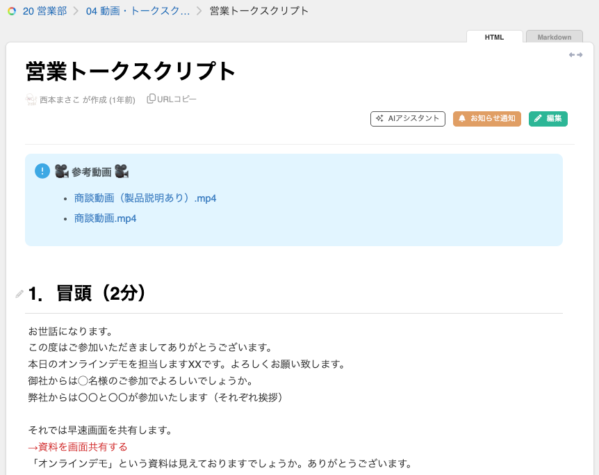 トップセールスの「話し方」を動画で学び、トークスクリプトで内容を補完する運用方法です。