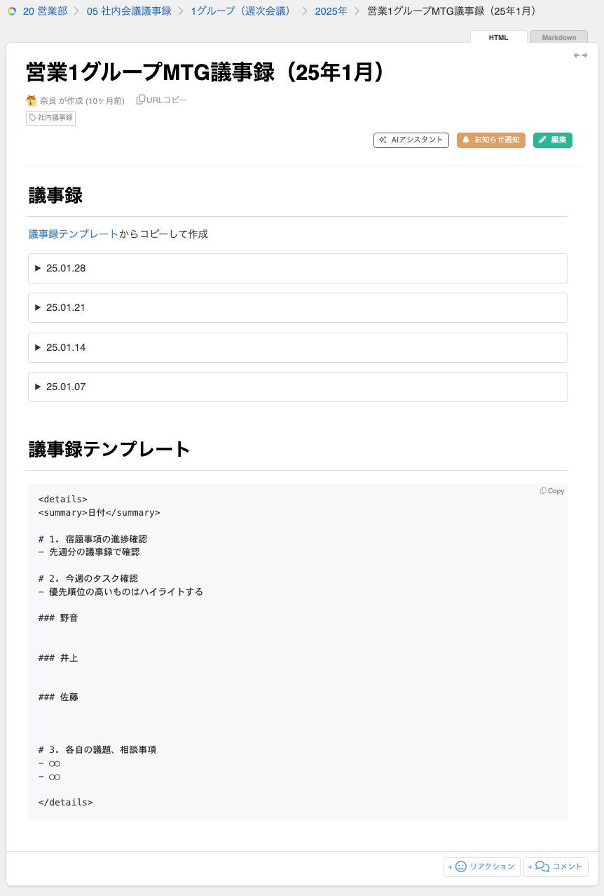 ・定例会議のたびに議事録ページが増えるのが煩わしい場合は、