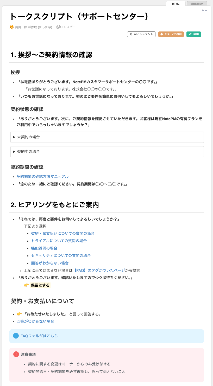 顧客応対時の流れやトークスクリプトを集約する運用例です。
