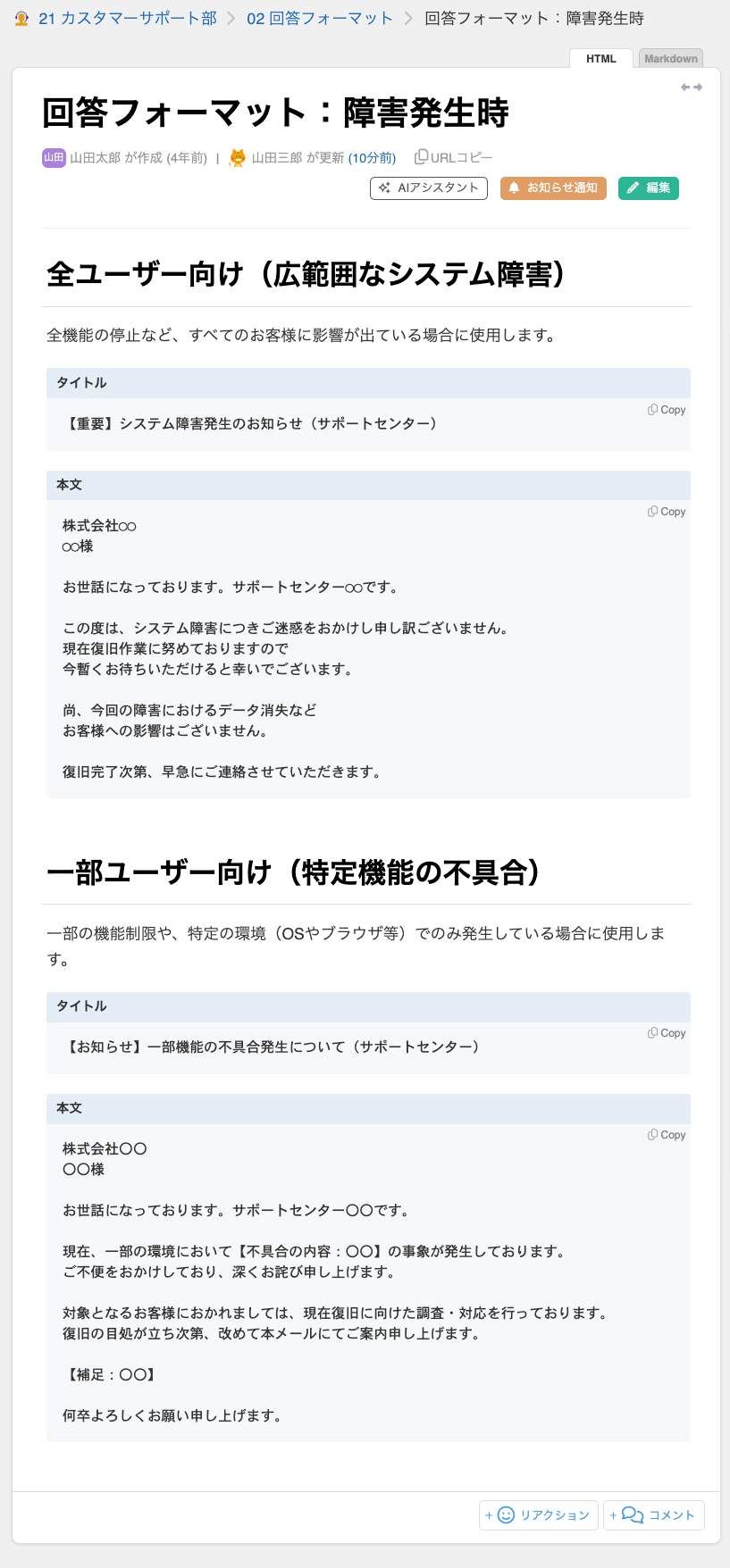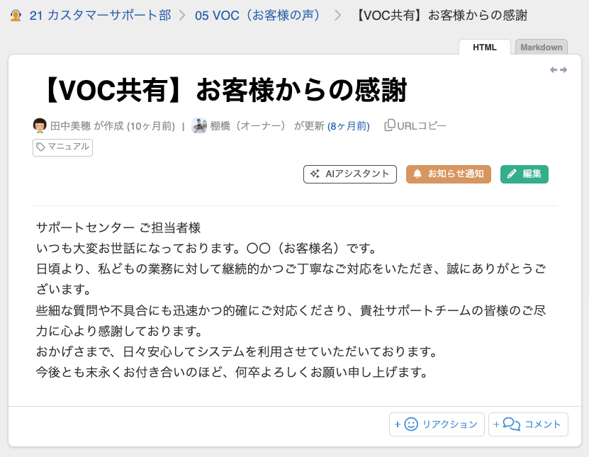 顧客対応で頻繁に使用する定型文や、回答フォーマットを集約する運用例です。