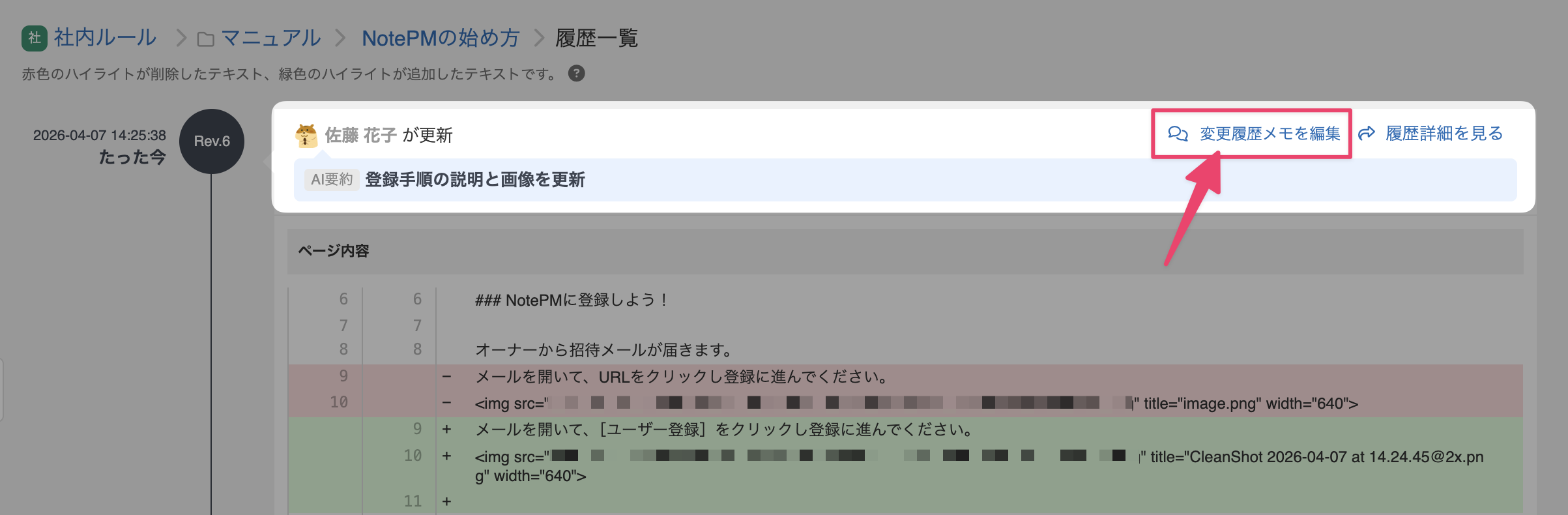 変更履歴メモを、ページ更新後に追加・編集できるようになりました!