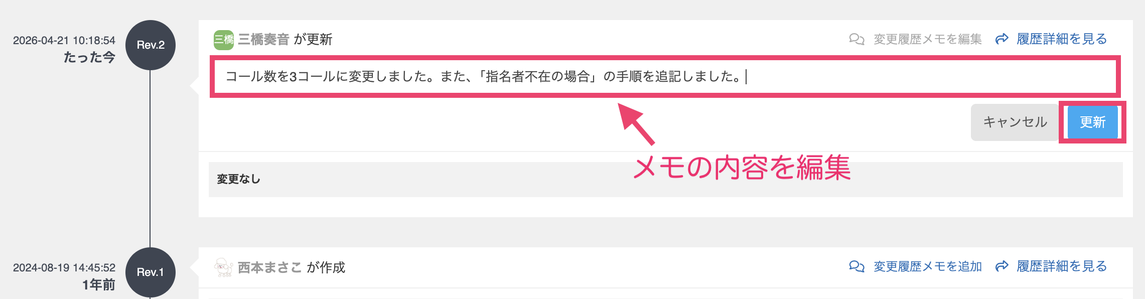- 「変更履歴メモを編集」をクリックし、メモの内容を編集します。