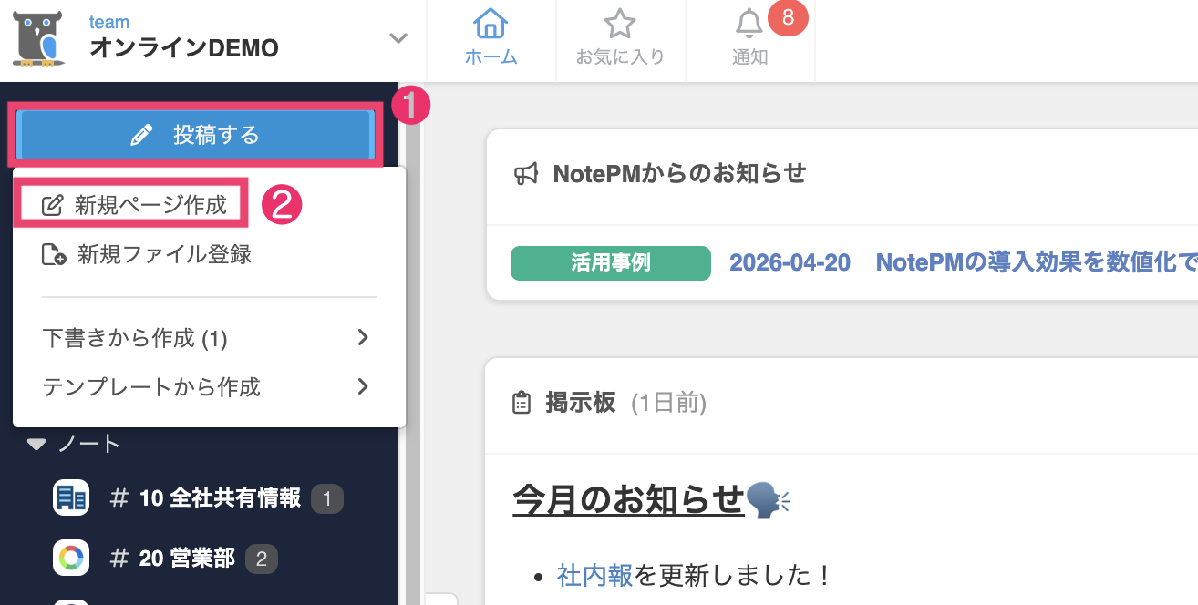 [投稿する]>[新規ページ作成]もしくはページ詳細画面の[編集]をクリックし、編集画面に移動します。