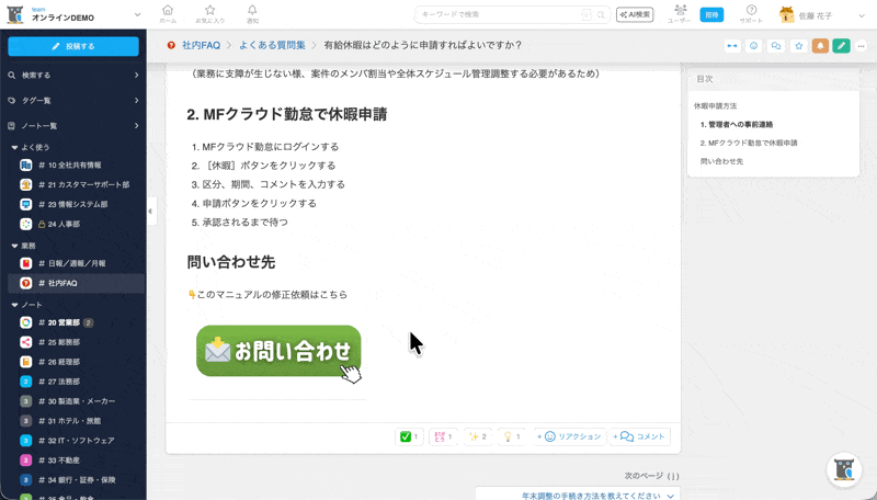 社内勉強会や、新機能についてのページに「質問はこちら!」「FAQはこちら!」といった大きな画像を設置し、ページやフォルダのURLをリンクする。